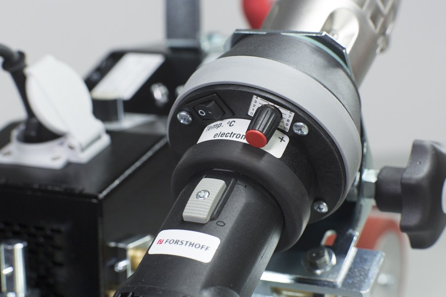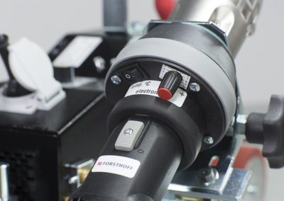 Produz opcionalmente soldas sobrepostas de 20, 30, 40 e 45 mm de largura e também pode ser convertida para soldadura em cabos de solda. Além disso, com a montagem de acessórios para soldadura de bainhas, a máquina automática pode ser utilizada sem dificuldade para a produção de bainhas de 20 mm, 30 mm, 40 mm e 45 mm. A potência térmica até 4000 W 230 V CA é infinitamente variável de 20 a 700 °C para um ajuste individual a diferentes materiais. A FORSTHOFF P2 arranca automaticamente após o cabeçote de soldadura ser rodado para dentro. Além disso, o ajuste de velocidade infinitamente variável da geração moderna de motores, com o seu desempenho até 18 m/min, em conjunto com o dispositivo de fixação para soldadura sem vincos, proporciona um resultado de soldadura ideal. Além disso, o suporte de três pontos